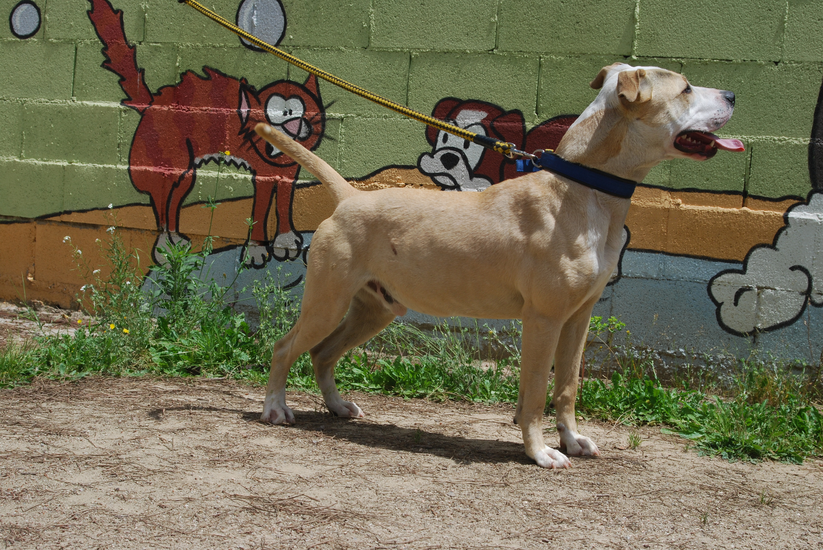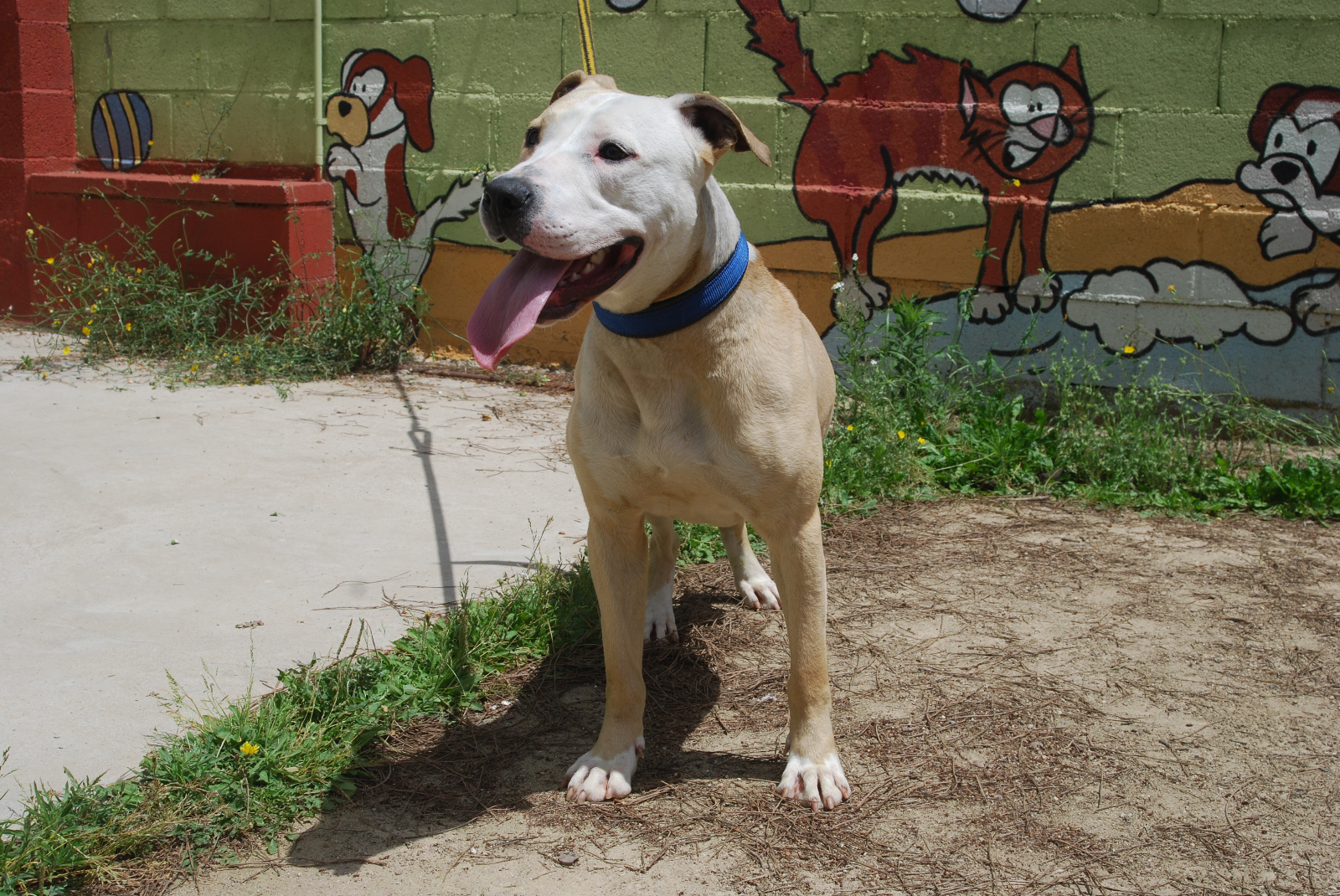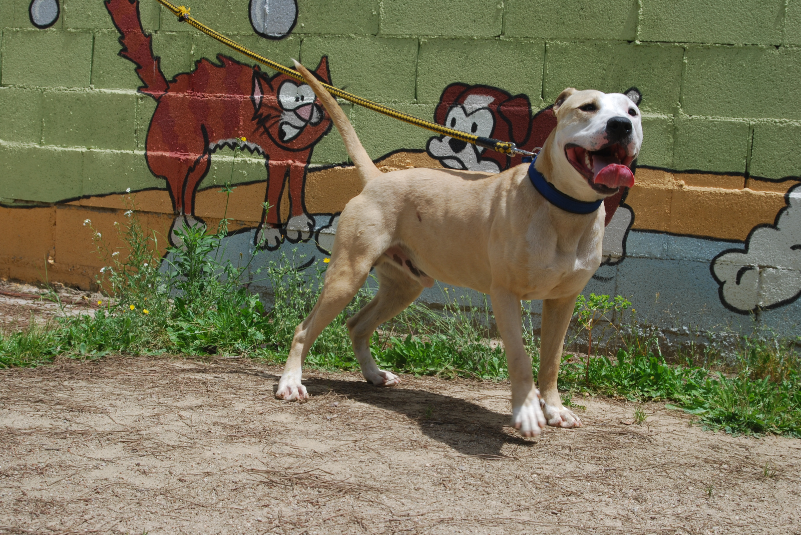 Jumbo entró en la protectora por un decomiso policial. Es un perro activo y juguetón. Con personas es un amor, cariñoso y atento. Puede convivir perfectamente con otros perros, es un poco brutote jugando, pero nunca con malas intenciones. Es positivo en Leishmania, pero tiene la enfermedad controlada gracias a una medicación diaria. Por razón de su raza, necesita seguro y licencia para Perros Potencialmente Peligrosos.