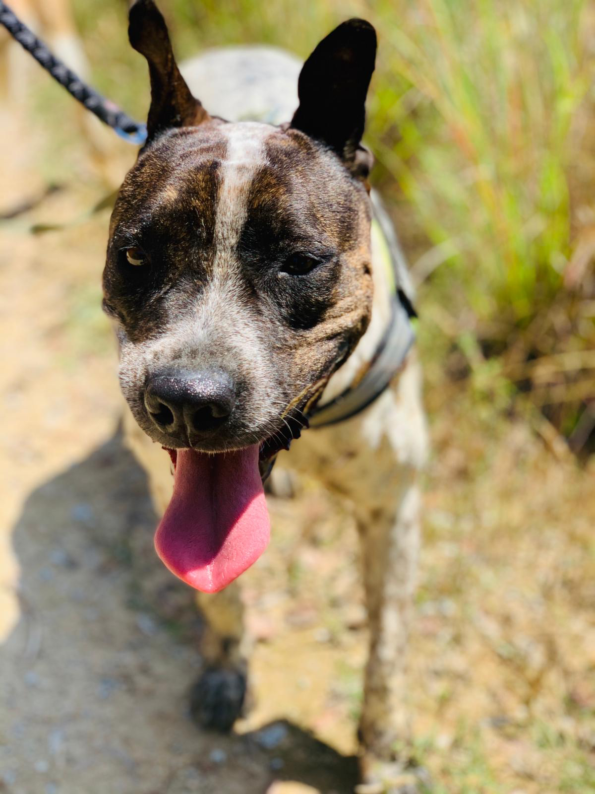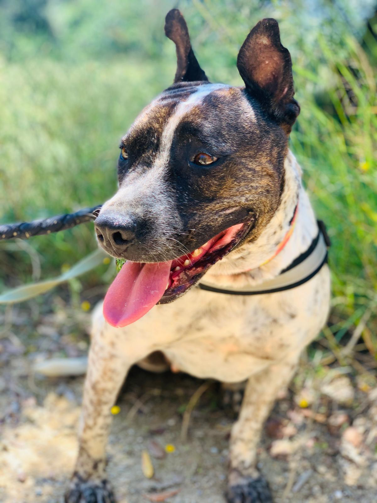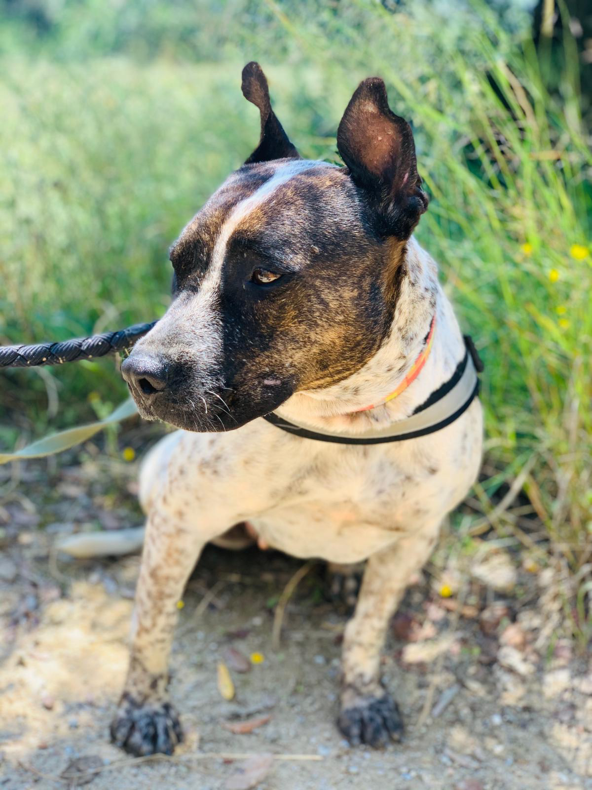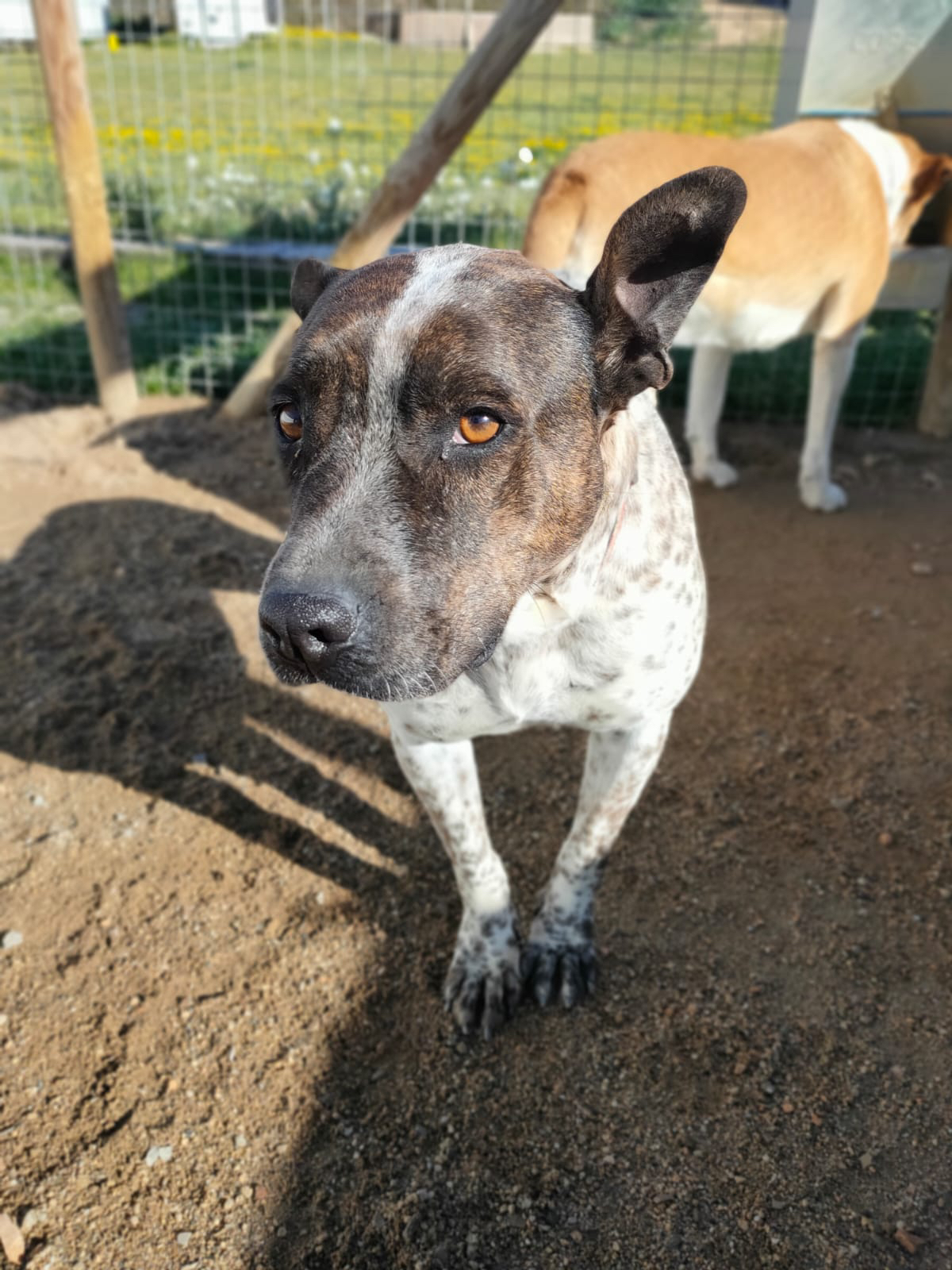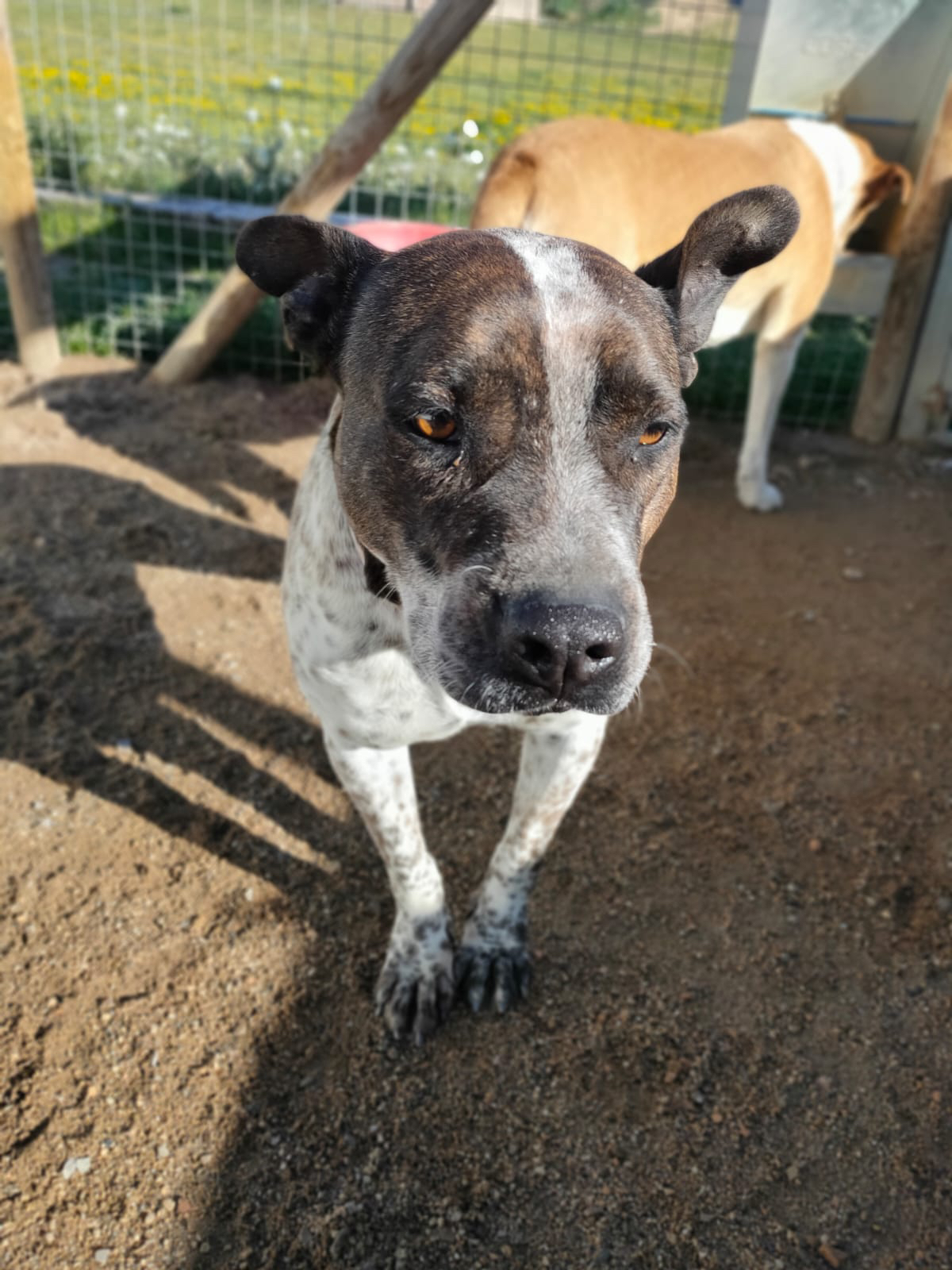 💚 Bianka llegó hace años ya a la prote, rescatada y traída desde Granada donde su destino era morir sacrificada. Es una mestiza de American Staffordshire, de tamaño mediano. Es miedosa pero tiene un carácter muy noble.