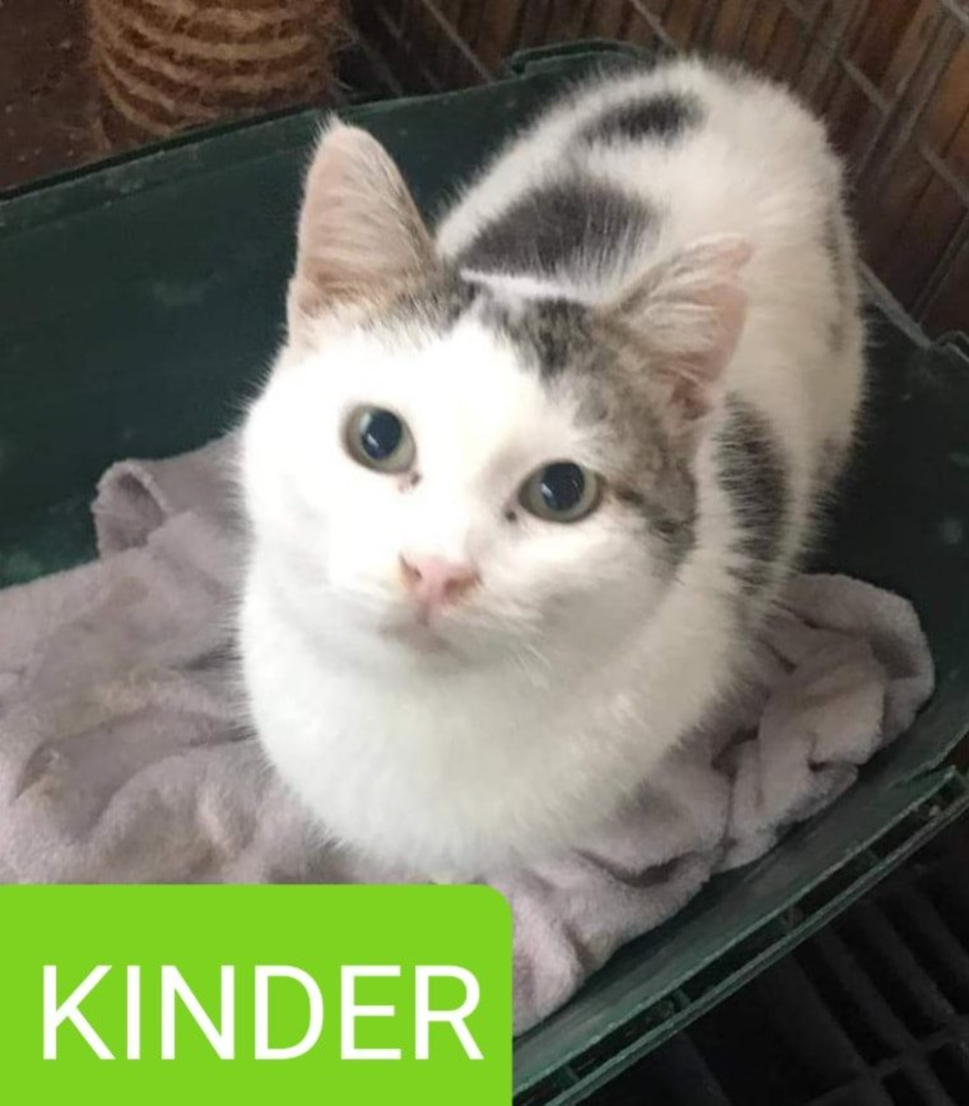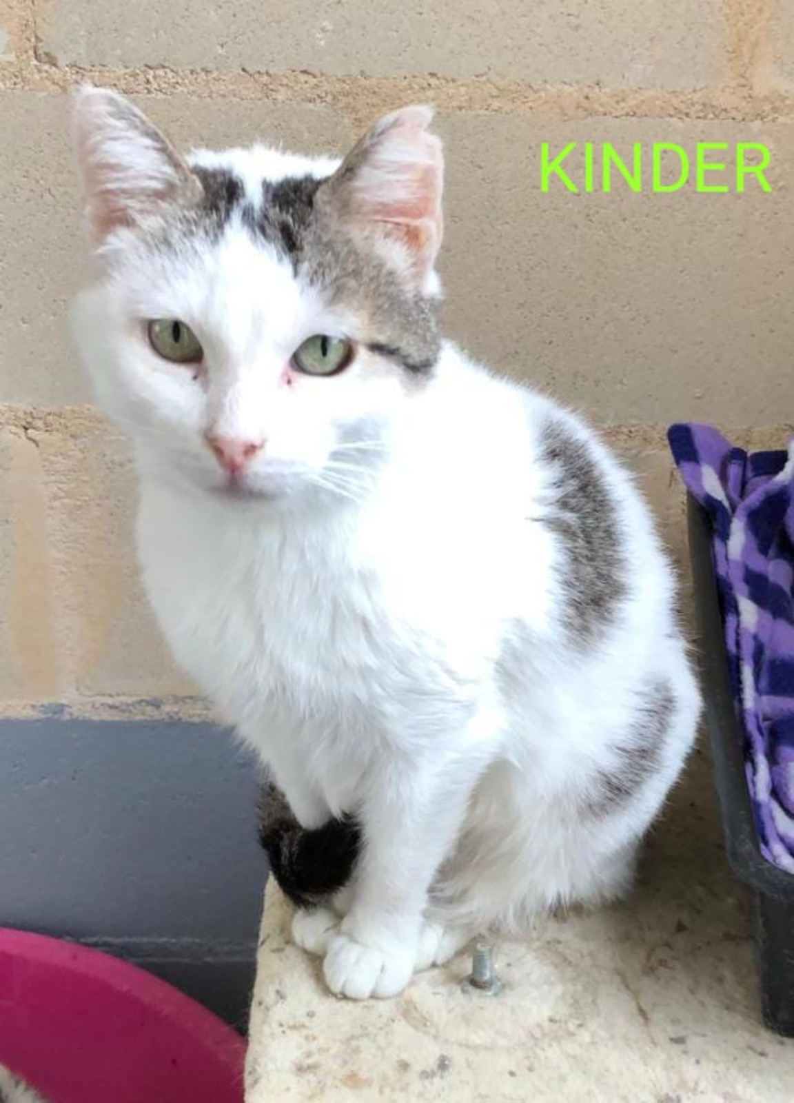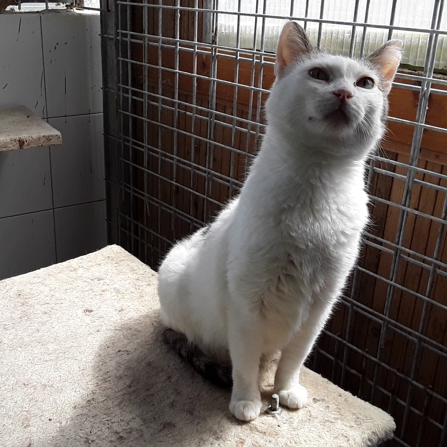 Es una gatita muy buena, no ha tenido la suerte de encontrar aún un hogar. Tiene leucemia felina, por lo que no puede convivir con gatos que no sean ya como ella portadores de la enfermedad.