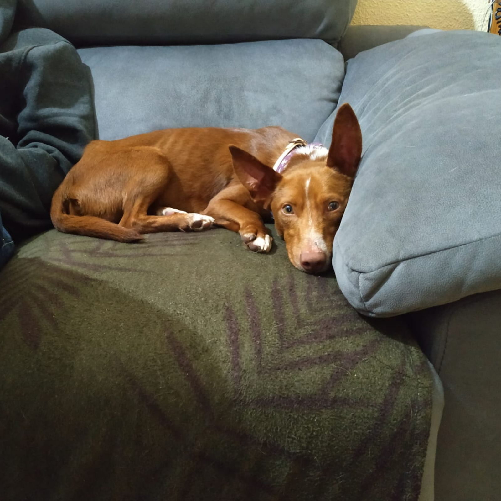 Ereic es un perrito maltratado, ha mejorado mucho, pero sigue teniendo bastante miedo, cuando coge confianza es cariñoso, convive bien con otros perros, pero se asusta al principio si no les conoce, es un podenco maneto, una de sus patitas esta un poco deformada, a causa de una fractura mal curada, posiblemente hecha a propósito.